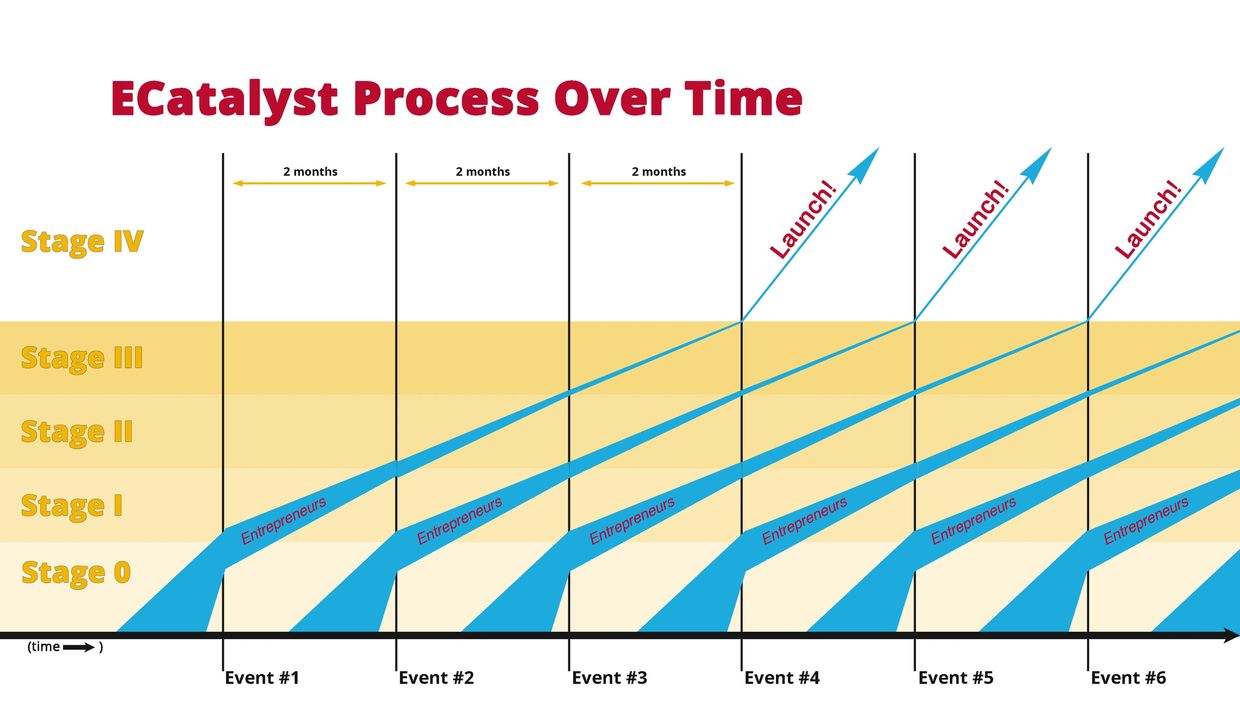At the beginning of ecosystem development (Phase 0), while the Catalytic Leader and the core team are gathering business leaders and casting the vision of Entrepreneurial Ecosystems, they are also gathering the first cohort of entrepreneurs from the community. Then, at the first event of Stage I, this cohort learns the principles that they act out every week for two months. Two months later, at the second event, we lead the first cohort through Stage II, but we also start a SECOND cohort at Stage I. Now, the entrepreneurs in the first cohort can mentor and even teach the content they just went to to the new cohort. This continues for each event after so we have 3 cohorts at the third even, and 4 cohorts for every subsequent event. (see drawing above)
